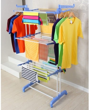 Cloth Drying Rack Carbon Steel Full Size Heavy Duty Double Pole 3 Layer Cloth Drying Stand, Laundry Rack Stand, Blue