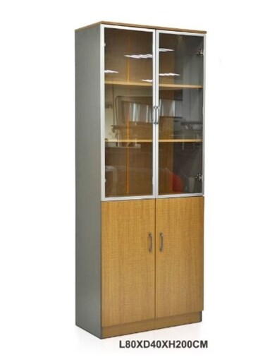 - Elevate your office decor with our modern 4 door wooden file cabinet and bookshelf, complete with glass doors and aluminum detailing. This stylish storage solution provides ample space for organizing files and books while adding a touch of elegance to your workspace.