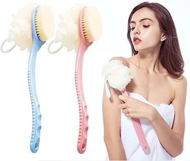 Long Handle Shower Body Brush with Bristles and Loofah, Back Scrubber Bath Mesh Sponge for Skin Exfoliating Brush, Massage Bristles Suitable for Men and Women Set of Two