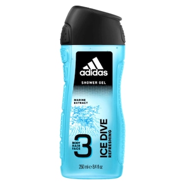 - يجمع جل الإستحمام من أديداس آيس دايف بين تركيبة تنظيف شعر الجسم والوجه 3 في 1 مع رائحة الأوزون المنعشة التي تلتقط الأحاسيس المثيرة للرياضات مثل ركوب الأمواج أو التزلج على الجليد.