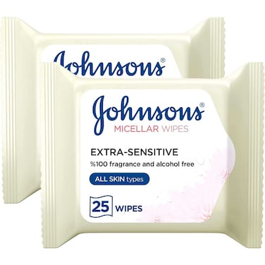 جونسون مناديل بخلاصة الميسيلار منظفة للوجه، فائقة اللطافة، لجميع أنواع البشرة، 25 منديل، حزمة من 2