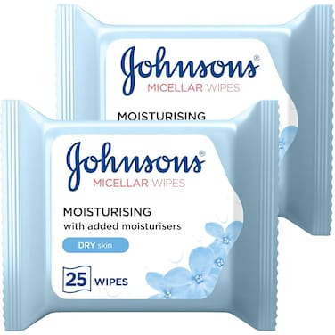 جونسون مناديل بخلاصة الميسيلار منظفة للوجه، مرطبة للبشرة الجافة، 25 منديل، حزمة من 2