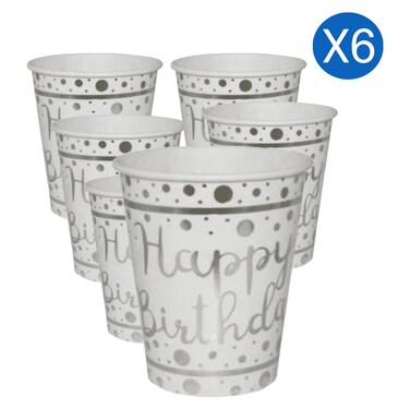 احتفل بيومك الخاص بأناقة مع هذه الأكواب الورقية المطبوعة من رقائق الفضة عيد ميلاد سعيد! مثالية لتقديم مشروبات الحفلات المفضلة لديك ، تأتي هذه الأكواب سعة 236 ملل في عبوة من 6 أكواب ليستمتع بها جميع ضيوفك. يضيف تصميم الفويل الفضي لمسة من الأناقة إلى احتفال عيد ميلادك.