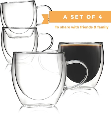 لاش مجموعة من 4 اكواب زجاجية مزدوجة الجدار بمقبض، 250 مل ، اكواب شفافة