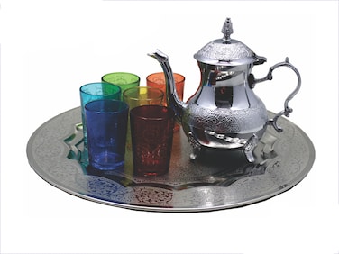 طقم صينية الشاي المغربي، إبريق شاي و 6 أكواب، فضي، (TO1399-H)