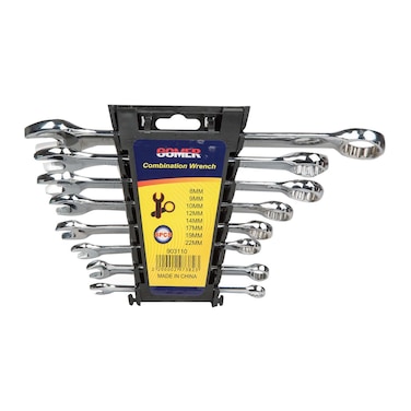 تتضمن مجموعة مفاتيح الربط غومر 903110 باللون الفضي 8 قطع، مما يجعلها إضافة متعددة الاستخدامات لأي صندوق أدوات. يتميز كل مفتاح ربط بمزيج من نهاية مفتوحة ونهاية صندوقية، مما يسمح بسهولة شد وفك الصواميل والمسامير.