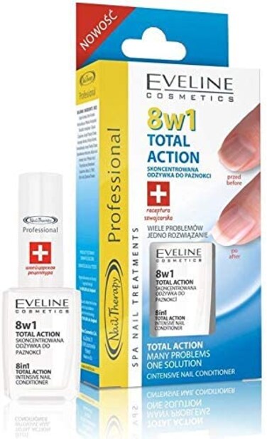 Intensive NAIL CONDITIONER TOTAL ACTION Revolutionary formula with active Strong Nail complex that penetrates nail structure, effectively regenerating and reconstructing it. Tightens, maximally hardens and stimulates the growth of nail plate. Improves flexibility making nails more resistant to mechanical injuries. Protects against cracking, braking and splitting. Helps to restore smooth surface and gloss shine to damaged and matt nails. As soon as after 10 days of treatment, all your problems will disappear and you will enjoy beautiful and healthy nails. Intensive treatment designed for damaged and brittle nails, also for weak nail plate care after nail tips removal.