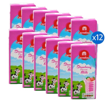 كارفور حليب كامل الدسم معقم بدرجة حرارة عالية بنكهة الفراولة 200 ملل حزمة من 12