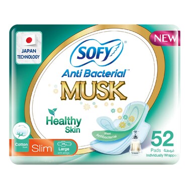 صوفي فوط صحية رقيقة مضادة للبكتيريا برائحة المسك بأجنحة كبيرة -أبيض- 52 فوطة