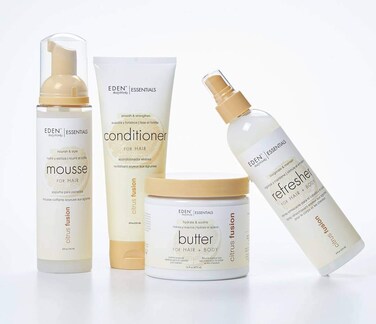 {1} EDEN Essentials Citrus Fusion Refresher Spray is a high humidity curl retention product and all over spray for daily use to revitalize hair and soothe skin.{2} Nutrient rich conditioner to fortify and strengthen the hair. Great as a rinse out or leave in. Smooths, Reduces Frizz, Nourishes, Thickens & Strengthens.{3} Mold and set hair with this lightweight foam. Perfect for wavy + curly textures and roller sets. Soft hold, Nourishing, Adds Shine, Volumizing, Nourish.{4} Dual-purpose moisturizer to hydrate and soothe. Leaves hair + skin silky and soft. Moisturizing, Lightweight, Absorbent, Hydrate & Soothe.