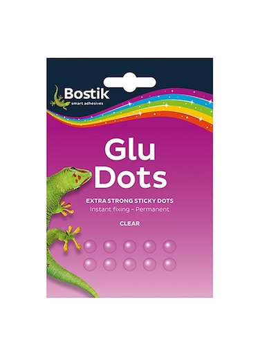 Bostik Extra Strong Glu Dots are circles of clear extra strong glue that stick to almost anything, including paper, wood, plastic, metal, glass and painted surfaces.