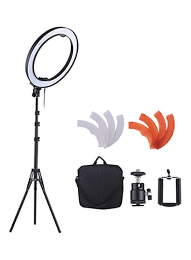 - <p>Circular catchlights can be taken easily<p>Brightness can be adjusted from 0% to 100%<p>Comes with one 2800K orange colour filter<p>The video light's housing adopts high quality ABS, with better texture, high impact-resistance, heat resistance, which will well protect the built-in LED beads.<p>Two cold shoe sockets are design on the video light, which can be used together with the included hot shoe ballhead and phone holder, suitable for phone photography.<p>Color: Black<p>Model Number: D407US<p>Size: 18 inch