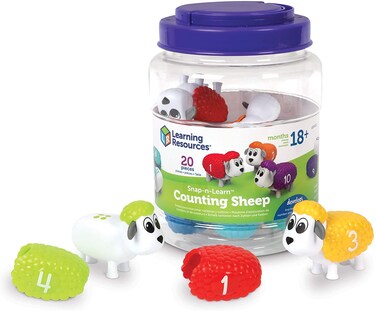 Learning Resources Snap-n-Learn Counting Sheep are a woolly, wonderful way to learn new number and colour skills. These educational toys include 10 friendly two-piece number sheep who are numbered 1–10 and ready for early maths lessons in number recognition, counting, sequencing, and more. Each sheep also features a different colour of the rainbow - instead of the usual white or black, these sheep have wool that's red, blue, orange, green, and more. Sized just right for little hands, the number sheep's' removable snap-on, snap-off fleeces double as a fine motor skills toy, and builds coordination and other essential skills. It also hides a surprise - each sheep also comes numbered with dots beneath their wool, which reinforce number recognition and add barnyard fun to matching games for two-year-olds. Snap-n-Learn Counting Sheep come with a reusable plastic storage tub that makes clean-up a snap.