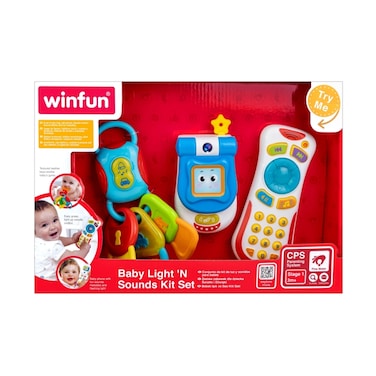 - Light-up key ring and 3 textured keys Pretend cell phone with safety mirror Easy grasp, light-up remote control Sound effects and fun melodies