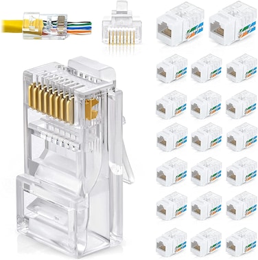 2 Items: RJ45 Cat6 Pass Through Connectors, Pack of 100 + RJ45 Cat6 / 5e Keystone Jacks, 20 Pack - White