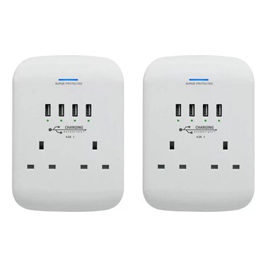 Charging Essentials Twin Socket Adaptor Surge Protected with 4 USB Chargers- Pack of 2
