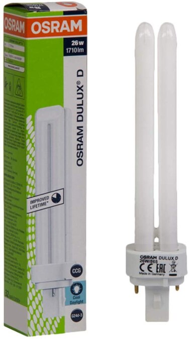 - Product Features: Brand: OsramColor: WhiteType: CFL BulbShape: TubeAverage Life: 10,000 hoursEnergy Consumption: 26 WattsLight Color: DaylightDetails: 2 Pin plug. Short and compact pin-base lamps with single-turn tubes. Suitable for operation on conventional control gear.</br></br><li>Brand: Osram<li>Color: White<li>Type: CFL Bulb<li>Shape: Tube<li>Average Life: 10,000 hours