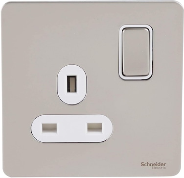 Schneider Electric Ultimate Pearl Nickel Screwless Flat Plate 13A 1 Gang 2 Way Single Switched Socket White Insert