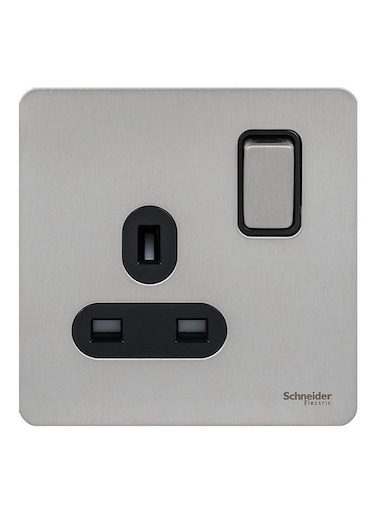 Schneider Ultimate Stainless Steel Screwless Flat Plate 13A 1 Gang Single Switch Socket Black Insert