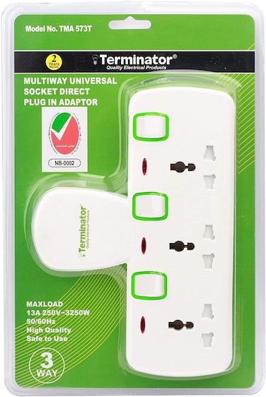• USAGE : Compatible for all home electrical appliances such as Mobile Phone Chargers, Notebook Computers, Digital Cameras, Game Consoles, Television, Hi-Fi System, Printer, Fax Machine, IT, PC, Water Heater, Coffee Heater, Electrical Oven, Electrical heater, Iron, Clothes Dryer, Automatic Cooker, Room Heater, Air Conditioners and other Electronic Products.CAUTION :THIS PRODUCT IS MEANT TO WORK AS A POWER EXTENSION SOCKET FOR VARIOUS TYPES OF THE PLUG PINS, AND IS NOT MEANT TO WORK AS VOLTAGE CONVERTER.SAFETY TIPS : Use indoors and in dry location only. Do not exceed the maximum loading of 3250 watts. Always have earth connections for safety reason. DO NOT USE PRODUCT IN A DAMP PLACE OR TOUCH WITH WET HANDS. IF IN DOUBT CONSULT A QUALIFIED ELECTRICIAN. | Brand : Terminator | Type : Plug SocketsAre batteries needed to power the product or is this product a battery : No | Is this a Dangerous Good or a Hazardous Material, Substance or Waste that is regulated for transportation, storage, and/or disposal? : No</br></br><li>Brand : Terminator<li>Type : Plug Sockets<li>Are batteries needed to power the product or is this product a battery : No<li>Is this a Dangerous Good or a Hazardous Material, Substance or Waste that is regulated for transportation, storage, and/or disposal? : No