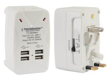 Terminator Brand Travel Adaptor One Universal Socket & 4 USB Charging Sockets (White)