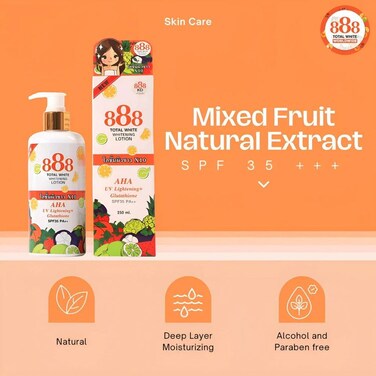 - <p>888 White Whitening Lotion </p><p>Make the skintone even, whiter and glowing. Protect the skin from sunlight SPF35+++ Did you know that Fruit Natural Extract is the bomb when it comes to getting rid of skin problems.</p><p>In 888 White hindi lang isa, dalawa or tatlo. It consists of Mixed Fruits Natural Extract. It also contains AHA, Niacinamide, Glutathione +++</p>