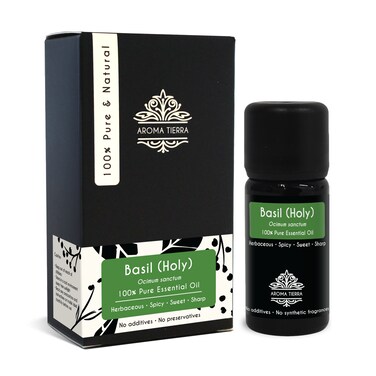 <li></b>Aroma Tierra Holy Basil Essential oil is 100% pure, natural and undiluted. It is extracted from high quality produce from India, by steam distillation of holy basil herb. It is free from chemicals, solvents, additives, synthetic fragrances and preservatives. The oil is very concentrated, potent and strong in therapeutic properties. Aroma Tierra takes great care to pack the oil in specially designed violet glass bottle to prevent damage from sunlight and preserve its potency. <li><li>Aroma Tierra offers a very wide selection of many other Essential oils such as Lavender, Peppermint, Frankincense, Rosemary, Tea Tree, Ylang Ylang, Bergamot, Oregano, Lemon, Thyme, Sweet Orange, etc., from across 35+ countries across 6 continents. With Aroma Tierra Essential oils, you can be assured of quality and potency - the company is very particular to use high quality produce that grows in its most natural climate, and processes it in a way that preserves maximum therapeutic benefits.