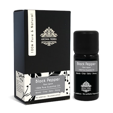 <li></b>Aroma Tierra Black Pepper Essential oil is 100% pure, natural and undiluted. It is extracted from high quality produce from India, by steam distillation of black pepper corns. It is free from chemicals, solvents, additives, synthetic fragrances and preservatives. The oil is very concentrated, potent and strong in therapeutic properties. Aroma Tierra takes great care to pack the oil in specially designed violet glass bottle to prevent damage from sunlight and preserve its potency. <li><li>Aroma Tierra offers a very wide selection of many other Essential oils such as Lavender, Frankincense, Rosemary, Tea Tree, Ylang Ylang, Bergamot, Oregano, Lemon, Thyme, Sweet Orange, etc., from across 35+ countries across 6 continents. With Aroma Tierra Essential oils, you can be assured of quality and potency - the company is very particular to use high quality produce that grows in its most natural climate, and processes it in a way that preserves maximum therapeutic benefits.