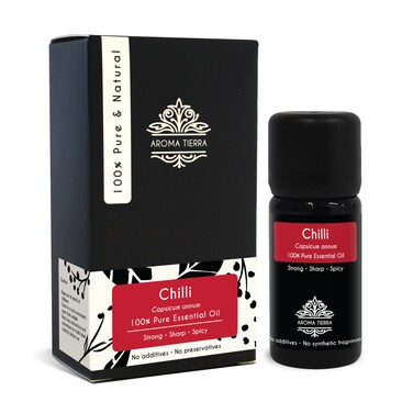<li></b>Aroma Tierra Chilli Essential oil is 100% pure, natural and undiluted. It is extracted from high quality produce from India, by steam distillation of chillies. It is free from chemicals, solvents, and preservatives. The oil is very concentrated, potent and strong in therapeutic properties. Aroma Tierra takes great care to pack the oil in specially designed violet glass bottle to prevent damage from sunlight and preserve its potency. <li><li>Aroma Tierra offers a very wide selection of many other Essential oils such as Lavender, Peppermint, Frankincense, Rosemary, Tea Tree, Ylang Ylang, Bergamot, Oregano, Lemon, Thyme, Sweet Orange, etc., from across 35+ countries across 6 continents. With Aroma Tierra Essential oils, you can be assured of quality and potency - the company is very particular to use high quality produce that grows in its most natural climate, and processes it in a way that preserves maximum therapeutic benefits.