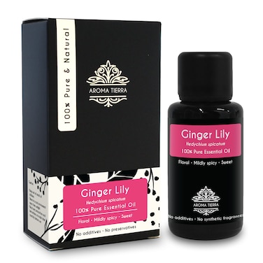 <li></b>Aroma Tierra Ginger Lily Essential oil is 100% pure, natural and undiluted. It is extracted from high quality produce from India, by steam distillation of dried rhizomes of Ginger lily. It is free from chemicals, solvents, and preservatives. The oil is very concentrated, potent and strong in therapeutic properties. Aroma Tierra takes great care to pack the oil in specially designed violet glass bottle to prevent damage from sunlight and preserve its potency. <li><li>Aroma Tierra offers a very wide selection of many other Essential oils such as Lavender, Peppermint, Frankincense, Rosemary, Tea Tree, Ylang Ylang, Bergamot, Oregano, Lemon, Thyme, Sweet Orange, etc., from across 35+ countries across 6 continents. With Aroma Tierra Essential oils, you can be assured of quality and potency - the company is very particular to use high quality produce that grows in its most natural climate, and processes it in a way that preserves maximum therapeutic benefits.