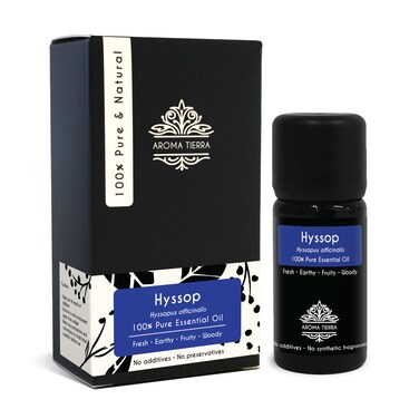 <li></b>Aroma Tierra Hyssop Essential oil is 100% pure, natural and undiluted. It is extracted from high quality produce from Hungary, by steam distillation of flowering plant tops of Hyssop. It is free from chemicals, solvents, additives, synthetic fragrances and preservatives. The oil is very concentrated, potent and strong in therapeutic properties. Aroma Tierra takes great care to pack the oil in specially designed violet glass bottle to prevent damage from sunlight and preserve its potency. <li><li>Aroma Tierra offers a very wide selection of many other Essential oils such as Lavender, Peppermint, Frankincense, Rosemary, Tea Tree, Ylang Ylang, Bergamot, Oregano, Lemon, Thyme, Sweet Orange, etc., from across 35+ countries across 6 continents. With Aroma Tierra Essential oils, you can be assured of quality and potency - the company is very particular to use high quality produce that grows in its most natural climate, and processes it in a way that preserves maximum therapeutic benefits.