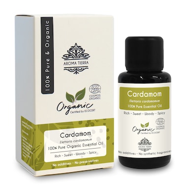 <li></b>Aroma Tierra Organic Cardamom Essential oil is extracted from high quality organic Cardamom seeds from India by steam distillation method. It is 100% pure, natural and ‘Certified Organic’ by ECOCERT, a reputed certification body from France. It is free from chemicals, solvents, additives, synthetic fragrances and preservatives. The oil is very concentrated, potent and strong in therapeutic properties. Aroma Tierra takes great care to pack the oil in specially designed violet glass bottle to prevent damage from sunlight and preserve its potency.<li><li>Aroma Tierra offers a very wide selection of many other Certified Organic Essential oils such as Lavender, Peppermint, Frankincense, Rosemary, Tea Tree, Ylang Ylang etc., and Certified Organic Face & Body Oils such as Argan, Jojoba, Rosehip, Castor, Coconut, Almond, Black Cumin, Hemp, Neem etc. With Aroma Tierra Essential oils, you can be assured of quality and potency as we are very particular to use high quality produce that grows in its most natural climate, and process it in a way that preserves maximum therapeutic benefits.