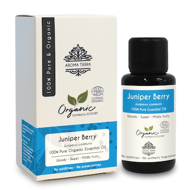 <li></b>Aroma Tierra Organic Juniper Berry Essential oil is extracted from high quality organic Juniper berries from Bulgaria by steam distillation method. It is 100% pure, natural and ‘Certified Organic’ by ECOCERT, a reputed certification body from France. It is free from chemicals, solvents, additives, synthetic fragrances and preservatives. The oil is very concentrated, potent and strong in therapeutic properties. Aroma Tierra takes great care to pack the oil in specially designed violet glass bottle to prevent damage from sunlight and preserve its potency.<li><li>Aroma Tierra offers a very wide selection of many other Certified Organic Essential oils such as Lavender, Peppermint, Frankincense, Rosemary, Tea Tree, Ylang Ylang etc., and Certified Organic Face & Body Oils such as Argan, Jojoba, Rosehip, Castor, Coconut, Almond, Black Cumin, Hemp, Neem etc. With Aroma Tierra Essential oils, you can be assured of quality and potency as we are very particular to use high quality produce that grows in its most natural climate, and process it in a way that preserves maximum therapeutic benefits.