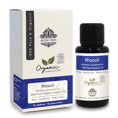 <li></b>Aroma Tierra Organic Niaouli Essential oil is extracted from twigs and leaves of high quality organic Niaouli tree from Madagascar by steam distillation method. It is 100% pure, natural and ‘Certified Organic’ by ECOCERT, a reputed certification body from France. It is free from chemicals, solvents, additives, synthetic fragrances and preservatives. The oil is very concentrated, potent and strong in therapeutic properties. Aroma Tierra takes great care to pack the oil in specially designed violet glass bottle to prevent damage from sunlight and preserve its potency.<li><li>Aroma Tierra offers a very wide selection of many other Certified Organic Essential oils such as Lavender, Peppermint, Frankincense, Rosemary, Tea Tree, Ylang Ylang etc., and Certified Organic Face & Body Oils such as Argan, Jojoba, Rosehip, Castor, Coconut, Almond, Black Cumin, Hemp, Neem etc. With Aroma Tierra Essential oils, you can be assured of quality and potency as we are very particular to use high quality produce that grows in its most natural climate, and process it in a way that preserves maximum therapeutic benefits.