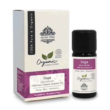 <li></b>Aroma Tierra Organic Sage Essential oil is extracted from leaves of high quality organic Sage herb from France by steam distillation method. It is 100% pure, natural and ‘Certified Organic’ by ECOCERT, a reputed certification body from France. It is free from chemicals, solvents, additives, synthetic fragrances and preservatives. The oil is very concentrated, potent and strong in therapeutic properties. Aroma Tierra takes great care to pack the oil in specially designed violet glass bottle to prevent damage from sunlight and preserve its potency.<li><li>Aroma Tierra offers a very wide selection of many other Certified Organic Essential oils such as Lavender, Peppermint, Frankincense, Rosemary, Tea Tree, Ylang Ylang etc., and Certified Organic Face & Body Oils such as Argan, Jojoba, Rosehip, Castor, Coconut, Almond, Black Cumin, Hemp, Neem etc. With Aroma Tierra Essential oils, you can be assured of quality and potency as we are very particular to use high quality produce that grows in its most natural climate, and process it in a way that preserves maximum therapeutic benefits.