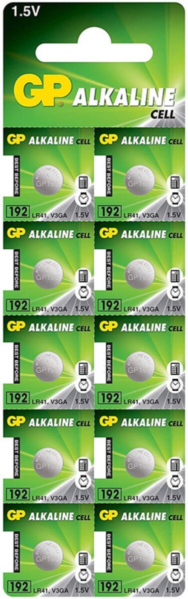 GP (192) LR41 AG3 Alkaline Cell 0% Mercury, 1.5V Batteries - 10 Pieces