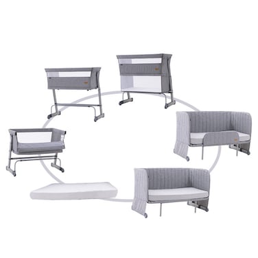 - Versatile Functionality: The Teknum All-in-1 Bedside Crib Cot & Sofa - Expansion Pack caters to your child's sleeping and play needs with its versatile design. Two Mattresses: This All-in-1 Bedside Crib comes with two mattresses, the smaller one when you use it as a Bassinet and bigger one when you use it as a Sofa. Age-Appropriate Use: Suitable for infants Bassinet, Bed Side Crib, Rocker, serving as a playpen for ages 0-36 months and transforming into a Toddler Bed and then a Sofa suitable for Kids and Adults, with a maximum weight-bearing capacity of 100kg. Durable Construction: Crafted from durable steel frame and the Teknum All in one comes with all parts to make to covert it as per the Child's need. Safety Features: EN Certified for safety standards, this expansion pack includes a guard rail for added safety during use with 100 Kg of weight bearing providing peace of mind for parents. Convenient Adjustments: Featuring 7 height adjustment positions with a locked mode and an easy pull-up button, this expansion pack offers stability and convenience. Equipped with wheels & brakes and a rope for bedside attachment, it ensures easy mobility and secure positioning. Stylish Design: Finished in a sleek silver frame color with powder coating, this expansion pack is bedside compatible with included straps for secure attachment, enhancing your child's sleeping and play space in style.