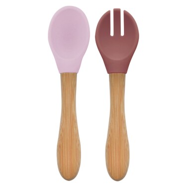 The Minikoioi Spoon and Fork 101060052 Pinky Pink Velvet Rose is a set of utensils designed for young children.