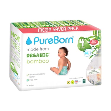 PureBorn Organic Bamboo Nappies Size 4 7-12kg Value Pack 96 Diapers