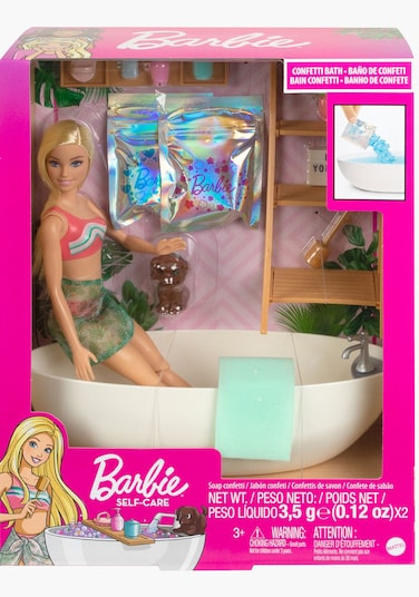 What’s more peaceful than a luxurious bath? This Barbie Confetti Bathtub and Doll Playset is Barbie doll's favorite -- and most colorful -- way to relax!