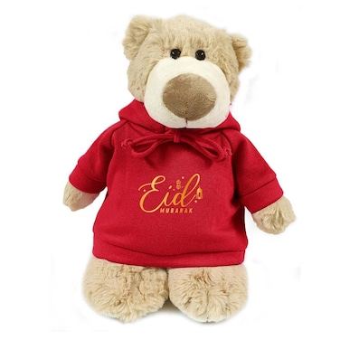 - The Caravaan Supersoft, cuddly bear with red Eid Mubarak hoodie, size 28cm. Soft and cuddly.