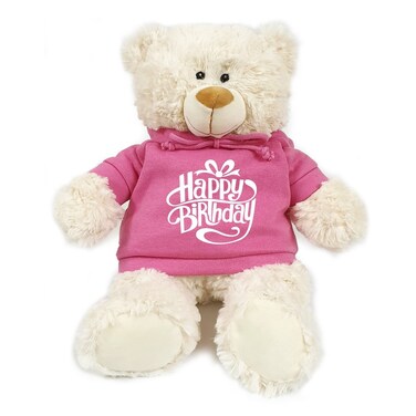Caravaan - Soft Toy Teddy Cream with Happy Birthday on Pink Hoodie Size 38cm