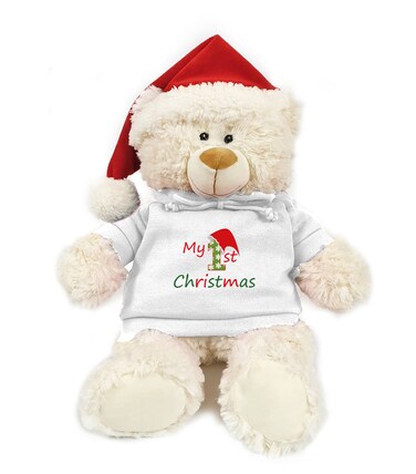 Caravaan -Super soft fluffy christmas teddy bear with My 1st Christmas print on trendy white hoodie and cute santa hat. Size 38cm. Ideal for Christmas gifting, boys, girls, family festivities and cele