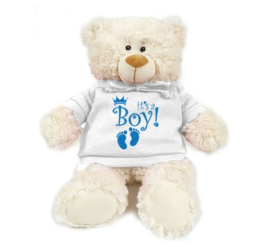 Caravaan, Supersoft, Cuddly Cream Bear With Blue It's A Boy! On Trendy White Hoodie Size 38cm Ideal For Celebration, Baby Birth Boys Parties Soft And Cuddly