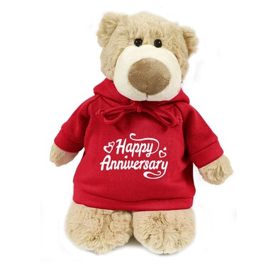 Caravaan, Supersoft, Cuddly Mascot Bear With Trendy Red Hoodie Happy Anniversary Size 28cm Ideal For Birthdays, Celebrations, Boys, Girls Parties Soft And Cuddly