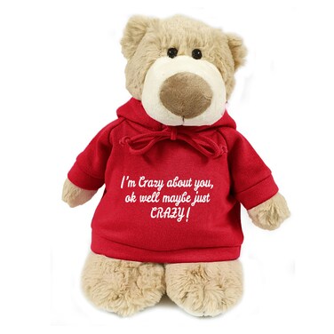Caravaan, Supersoft, Cuddly Mascot Bear With Trendy Red Hoodie I'M Crazy About You, Ok Well Maybe Just Crazy, Size 28cm Ideal For Birthdays, Boys, Girls Parties Soft And Cuddly