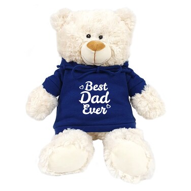 Supersoft, cuddly cream bear with trendy blue hoodie Best Dad Ever. Ideal for Fathers Day, Thank You Teacher's Gift or first day at work. Suitable for boys and adults. Size 38cm