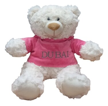 Supersoft, cuddly cream bear with embroidered "DUBAI" on trendy pink velour hoodie. Size 38cm. Ideal for new baby, baby shower, baby gender reveal parties. Soft and cuddly.