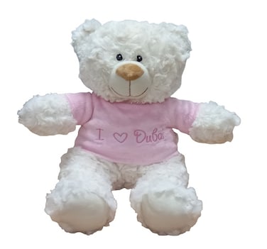 Supersoft, cuddly cream bear with embroidered "I Heart Dubai" on trendy pink velour hoodie. Size 38cm. Ideal for new baby, baby shower, baby gender reveal parties. Soft and cuddly.