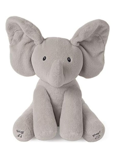 FLAPPY THE ELEPHANT: Animated plush Flappy the Elephant by Baby GUND is an adorable singing animated plush with two different play modes Press the left foot to play an interactive game of peek-a-boo, and the right to hear the song "Do Your Ears Hang Low" in a cute child's voice